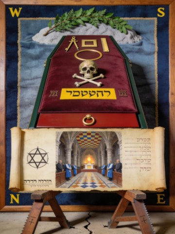 Au grade de Maître, le tapis porte un cercueil. La représentation (nom donné au tapis de loge dans plusieurs rituels) figure la mort d'Hiram Abieff et, à travers elle, la mort symbolique du récipiendaire lui-même. Les trois pas d'enjambement sont décrits avec une précision anatomique rare :