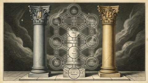 Le récipiendaire qui enjambe le tapis trois fois ne parcourt pas simplement des directions géographiques : il traverse les trois colonnes de l'Arbre de Vie. Il accomplit dans son corps le chemin du Sentier du Milieu — non pas en choisissant entre la Rigueur et la Miséricorde, mais en les traversant toutes les deux pour parvenir à l'équilibre de Tipheret. Et c'est précisément là, sur la colonne centrale, à l'Orient, que le nouveau Maître reçoit le Mot substitué : Tipheret lui est communiquée.