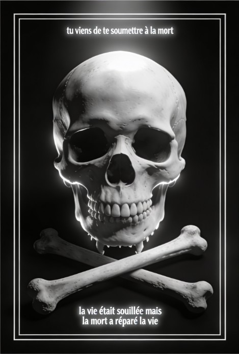 On y voit une tête de mort sur deux os en sautoir, avec cette inscription au‑dessus : « Tu viens de te soumettre à la mort », et, au‑dessous : « La vie était souillée, mais la mort a réparé la vie ».