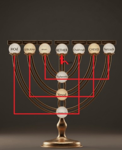 Pour une lecture kabbalistique, cette structure se prête naturellement à une superposition sur l’Arbre des sefirot – et, plus précisément encore, sur la forme de la ménorah séphirotique.